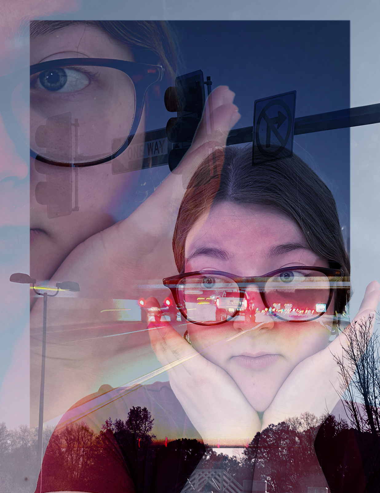 All of the components in my piece were original photos that I took at home. For the background I made light trails in a dark room with a phone flashlight, then recolored them and overlapped multiple of them to create the busy effect that I wanted. I used my roommate as the subject and used a variety of blur filters and tools to blend the angles together.