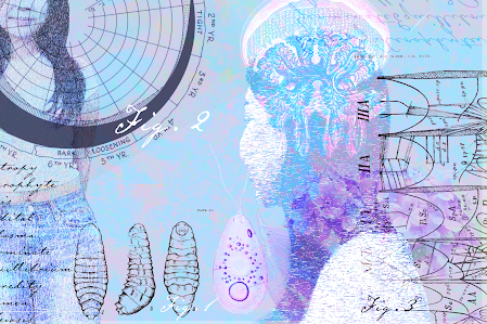 The concept works well in the final portfolio because of the cohesive design and how no element overpowers another. It looks like she used a lot of overlays and blending which helped highlight certain elements in the composition since the background isn't included in the layered images. Looking at all the works, one that stood out to me was Untitled 5. This work, although I feel fits the theme the subject on the right is too densely saturated and could have a lower opacity. The work is original and creative without being repetitive because of the change in scale, placement, and scientific elements. Meg, I think built from her artistic influence and created work that was unique to her art style and showed her personal creativity.